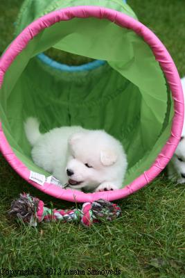 Tatiana, from Moonstar Samoyeds, having some fun with pups.